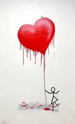 Il contrasto tra il cuore intenso e il palloncino leggero mette in evidenza la dicotomia tra la profondità delle emozioni umane e la leggerezza dell’infanzia.