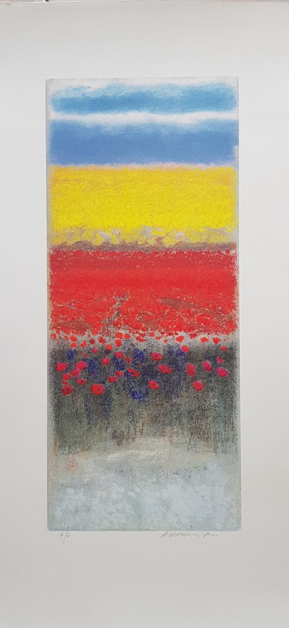 Raffinata astrazione, straordinaria bellezza e semplicità in queste serigrafie di Natale Addamiano. In ciascuna grafica la gamma cromatica gioca su variazioni di colori. I cieli vibrano di piccoli segni di luce, in variazioni infinite caratterizzate da larghe campiture che muovono lo spazio con una felicità e poesia pittorica unica, i paesaggi decantano sensazioni e colori, quasi a voler essere là.