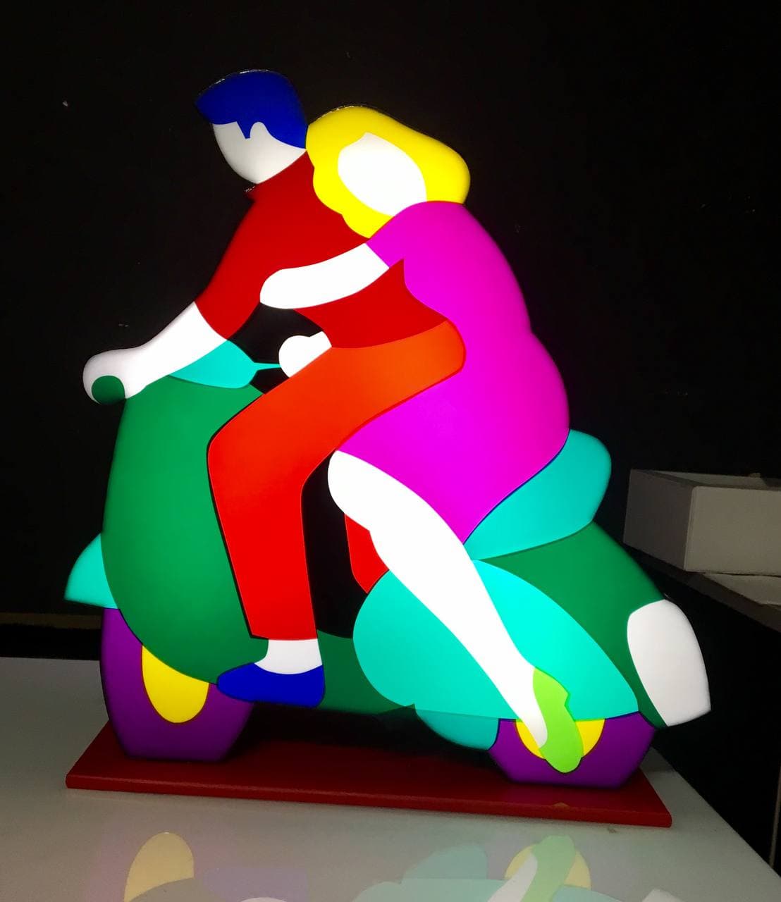 La scultura del Maestro Marco Lodola, contiene un insieme di elementi quali la luce, il colore e la creatività come ingredienti fondamentali che caratterizzano il suo percorso artistico. In queste creazioni luminose realizzate in perspex, l’anima pop di Lodola si manifesta appunto per stare in mezzo a noi, parlando con semplicità il linguaggio comune.