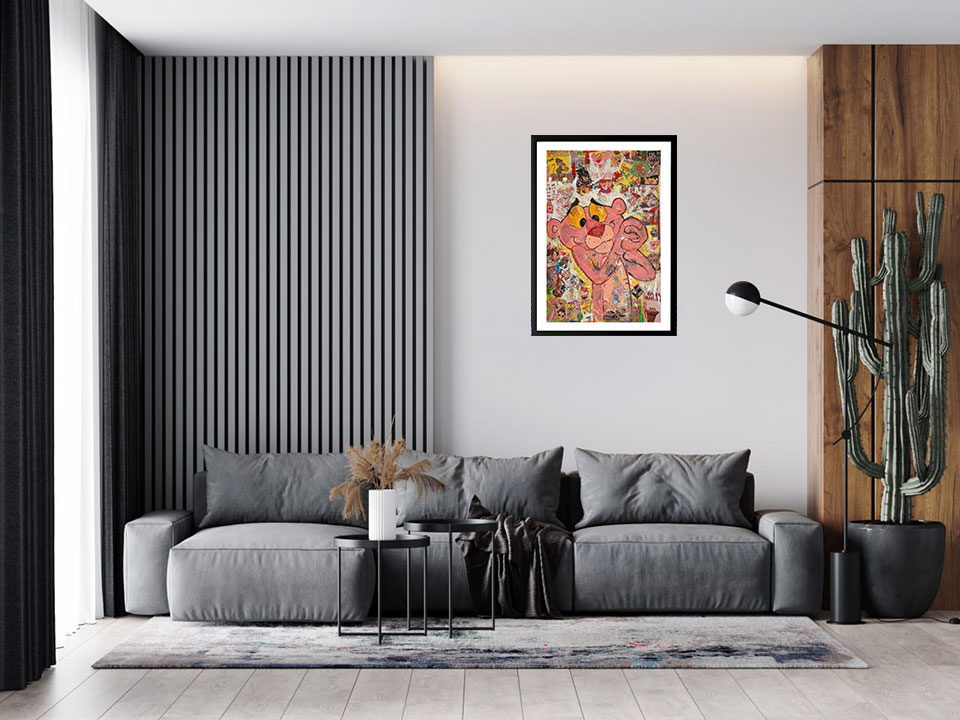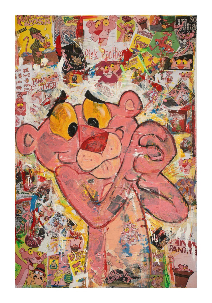 Vincenzo Mascoli rappresenta il personaggio su una composizione in collage dove il protagonista è un Supereroe, l’opera diventa un racconto nel racconto dove il fruitore può cogliere non solo il soggetto in primo piano ma anche tutta la sua storia e il cambiamento in varie trame.