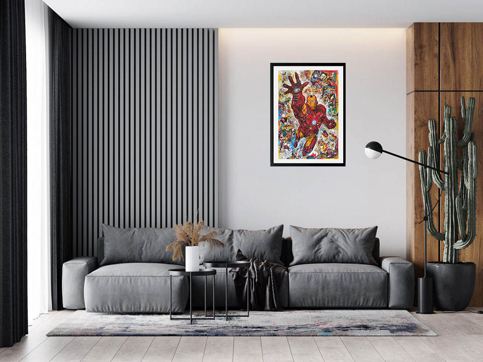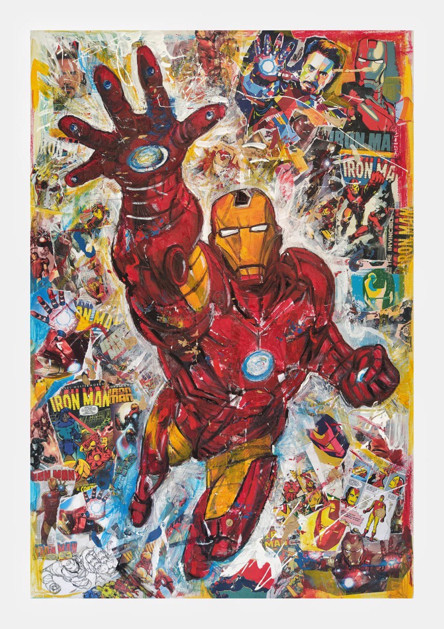 Vincenzo Mascoli rappresenta il personaggio su una composizione in collage dove il protagonista è un Supereroe, l’opera diventa un racconto nel racconto dove il fruitore può cogliere non solo il soggetto in primo piano ma anche tutta la sua storia e il cambiamento in varie trame.
