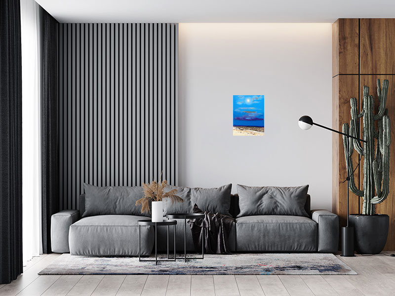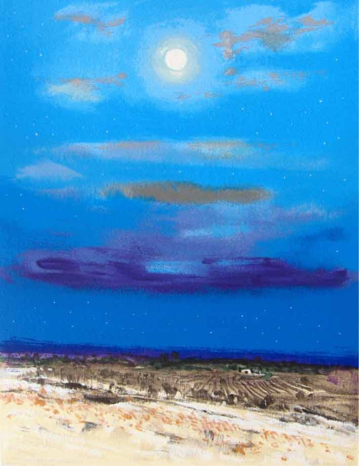 Raffinata astrazione, straordinaria bellezza e semplicità in queste serigrafie di Natale Addamiano. In ciascuna grafica la gamma cromatica gioca su variazioni di colori. I cieli vibrano di piccoli segni di luce, in variazioni infinite caratterizzate da larghe campiture che muovono lo spazio con una felicità e poesia pittorica unica, i paesaggi decantano sensazioni e colori, quasi a voler essere là.