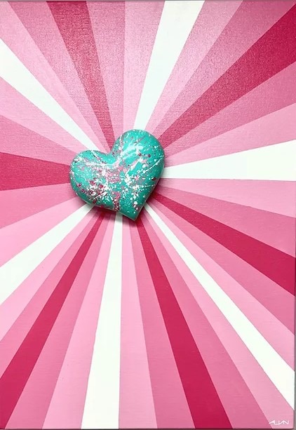 Ogni opera è unica, con cuori meticolosamente creati a mano su sfondi con raggi colorati dalle varie sfumature.