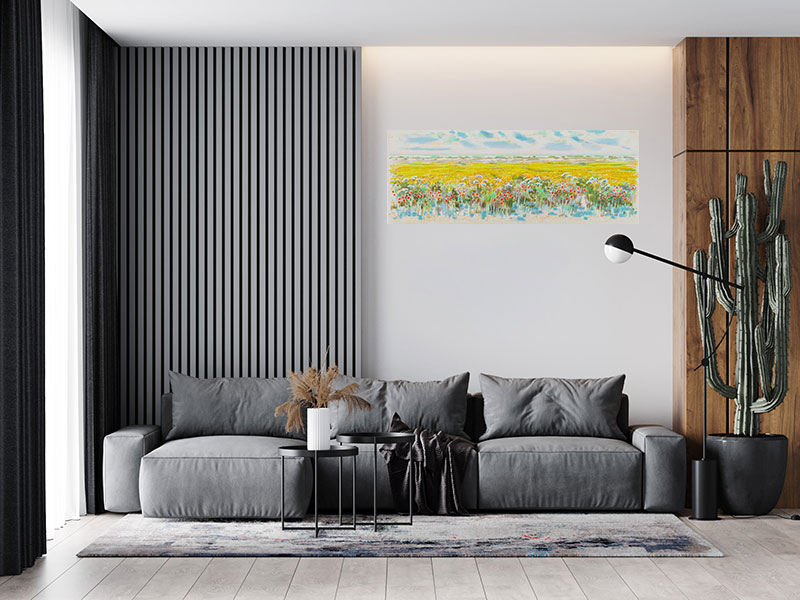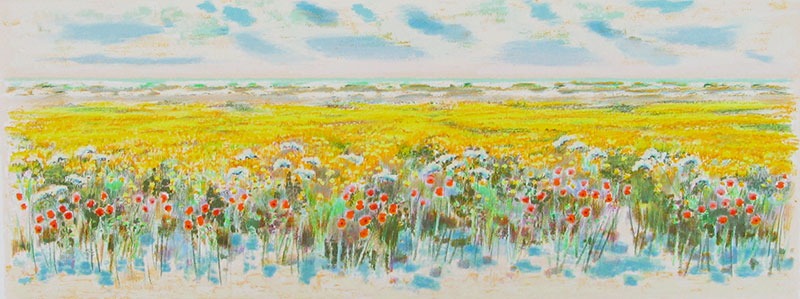 Raffinata astrazione, straordinaria bellezza e semplicità in queste serigrafie di Natale Addamiano. In ciascuna grafica la gamma cromatica gioca su variazioni di colori. I cieli vibrano di piccoli segni di luce, in variazioni infinite caratterizzate da larghe campiture che muovono lo spazio con una felicità e poesia pittorica unica, i paesaggi decantano sensazioni e colori, quasi a voler essere là.