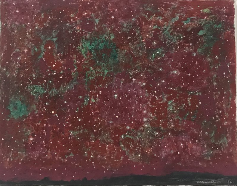 Il paesaggio di Addamiano è appercezione biografica, prima di tutto, è immersione e fluenza affettiva: e ogni cielo è la pagina di un privatissimo journal, notte dopo notte, luce dopo luce, sentimento dopo sentimento. La condizione che egli sceglie per se stesso è quella della plenitudine dell’immersione emotiva, ma allo stesso tempo di una messa in distanza della visione: l’orizzonte non è transito possibile, ma confine incoercibile della lontananza assoluta, dell’irraggiungibile. Protagonista assoluto, dunque, il cielo stellato. Addamiano lo ausculta in profondità , ne risente gli umori ultimi, attraverso il suo istinto, vocazionale e insieme affinatissimo per tecniche, del colore.