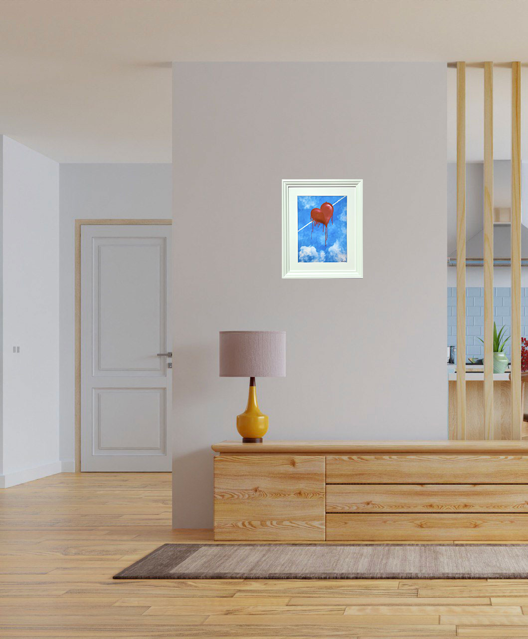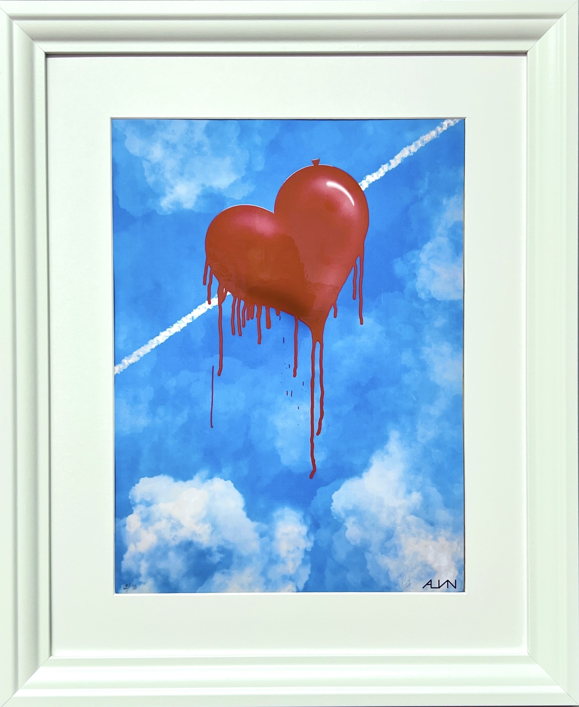 La stampa presenta un cielo azzurro con soffici nuvole e un palloncino rosso a forma di cuore che fluttua senza sforzo, con una striscia bianca lasciata da un aeroplano sullo sfondo, suggerendo l’amor proprio come soluzione a molti problemi.