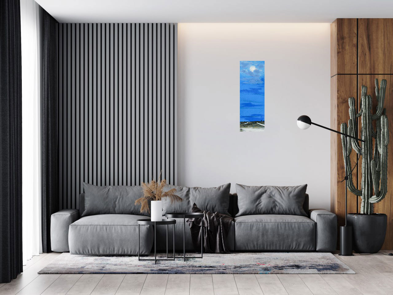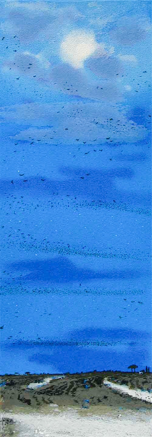 Raffinata astrazione, straordinaria bellezza e semplicità in queste serigrafie di Natale Addamiano. In ciascuna grafica la gamma cromatica gioca su variazioni di colori. I cieli vibrano di piccoli segni di luce, in variazioni infinite caratterizzate da larghe campiture che muovono lo spazio con una felicità e poesia pittorica unica, i paesaggi decantano sensazioni e colori, quasi a voler essere là.