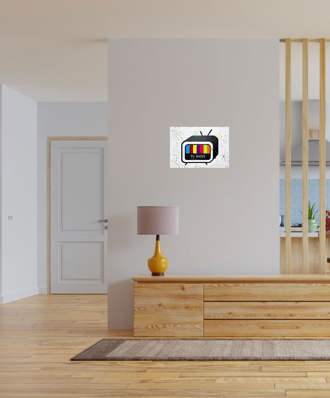 Su una tela appare il messaggio “TV SUCKS”, riflettendo il crescente disincanto nei confronti della televisione come mezzo d’intrattenimento.