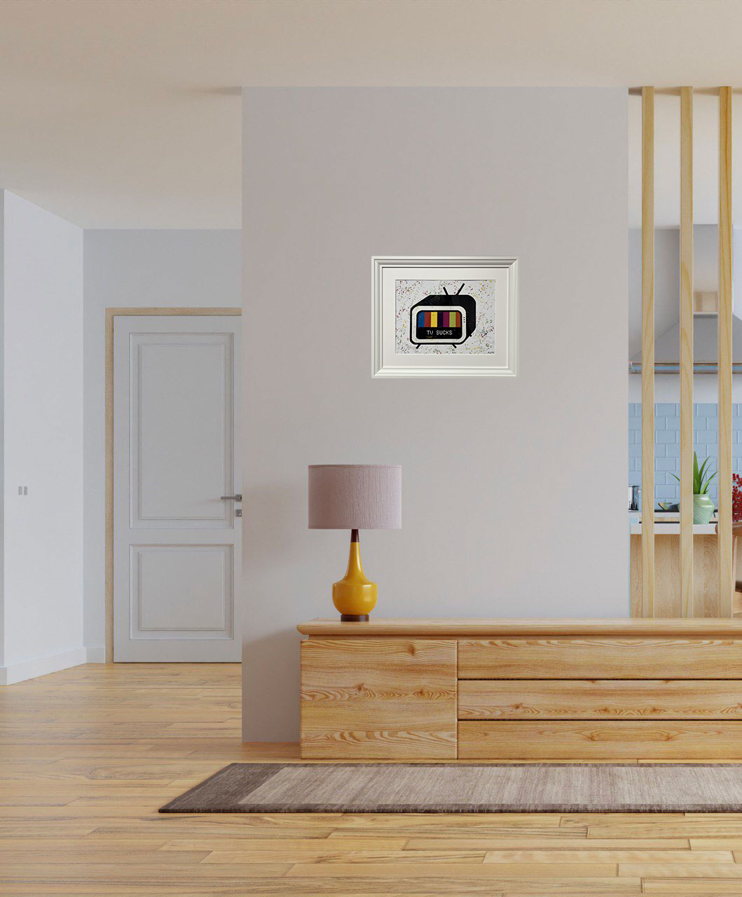 Su una tela appare il messaggio “TV SUCKS”, riflettendo il crescente disincanto nei confronti della televisione come mezzo d’intrattenimento.