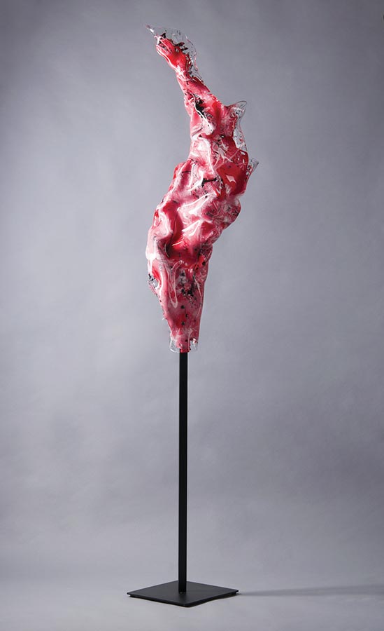 Scultura in metacrilato pigmentata con smalti e termoformata, ferro verniciato a polvere, firmata dall’artista attraverso microsabbiatura.