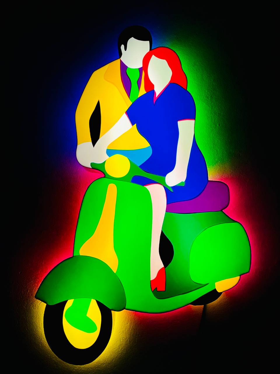 La scultura del Maestro Marco Lodola, contiene un insieme di elementi quali la luce, il colore e la creatività come ingredienti fondamentali che caratterizzano il suo percorso artistico. In queste creazioni luminose realizzate in perspex, l’anima pop di Lodola si manifesta appunto per stare in mezzo a noi, parlando con semplicità il linguaggio comune.
