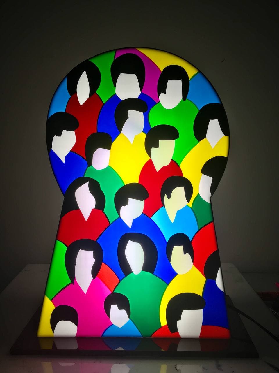 La scultura del Maestro Marco Lodola, contiene un insieme di elementi quali la luce, il colore e la creatività come ingredienti fondamentali che caratterizzano il suo percorso artistico. In queste creazioni luminose realizzate in perspex, l’anima pop di Lodola si manifesta appunto per stare in mezzo a noi, parlando con semplicità il linguaggio comune.