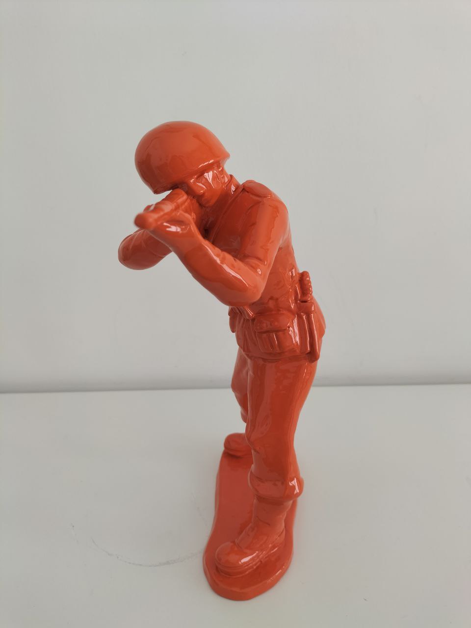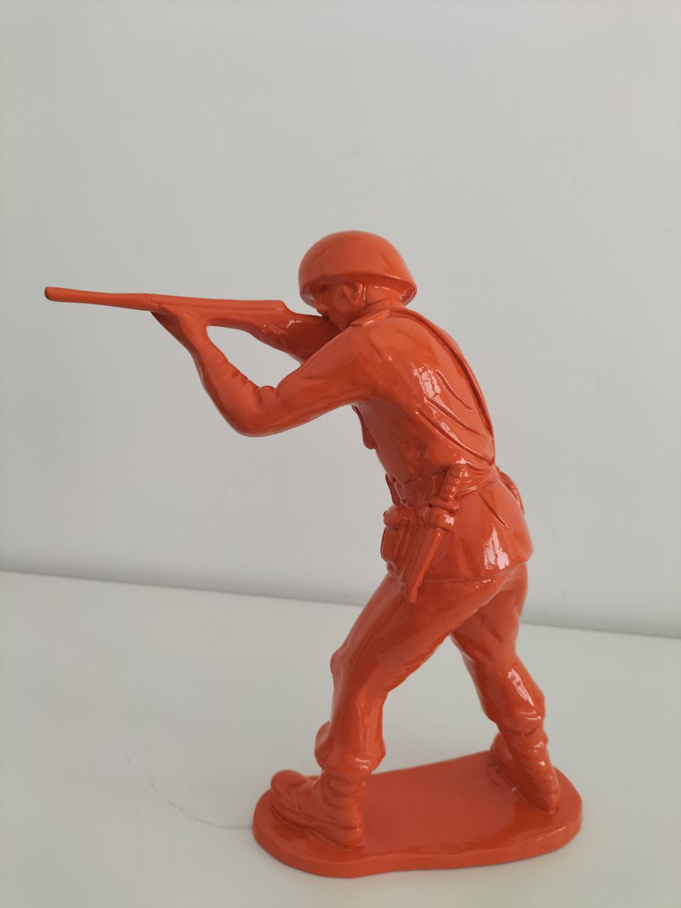 La scultura di Alessandro Padovan raffigura il classico soldatino giocattolo in plastica creato in vari colori Pop.